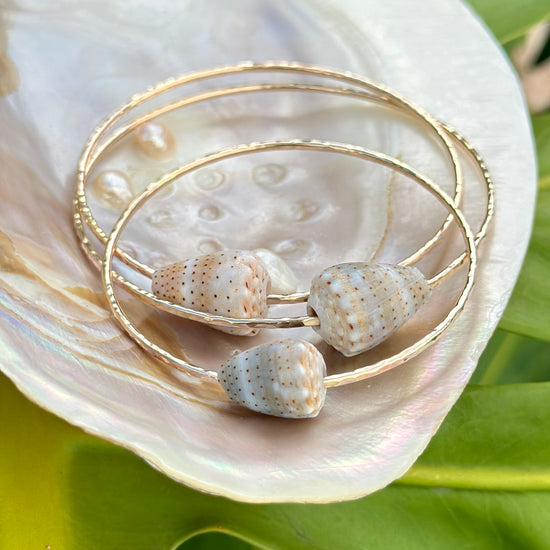 You can never go wrong with this cone shell bangle! With its intricate design and captivating color combinations, this Abbreviated Cone Shell Bangle is perfect for any look. Made from handpicked shells on Oʻahu, each shell is unique and has its own distinct pattern that makes it truly one of a kind.