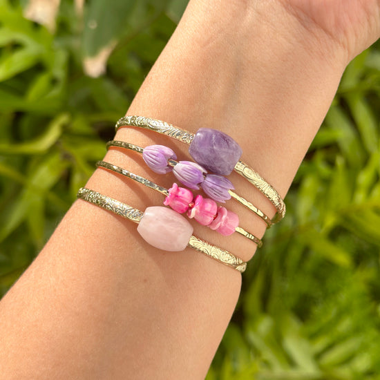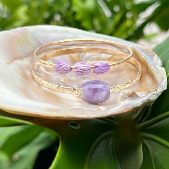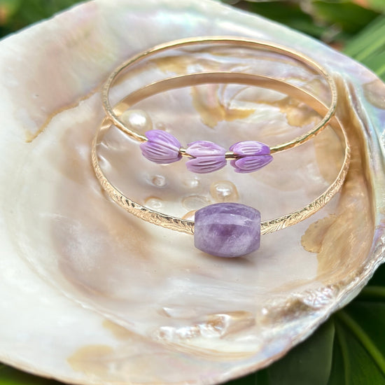 Introducing the Aloha Wau Iā ʻOe Set! This is the perfect way to indulge in all things poni. The set includes two beautiful bangles that can be worn alone or together. One bangle features 3 dainty Pikake poni puaʻs, while the other has a chunky amethyst barrel on a Liliʻuokalani bangle.