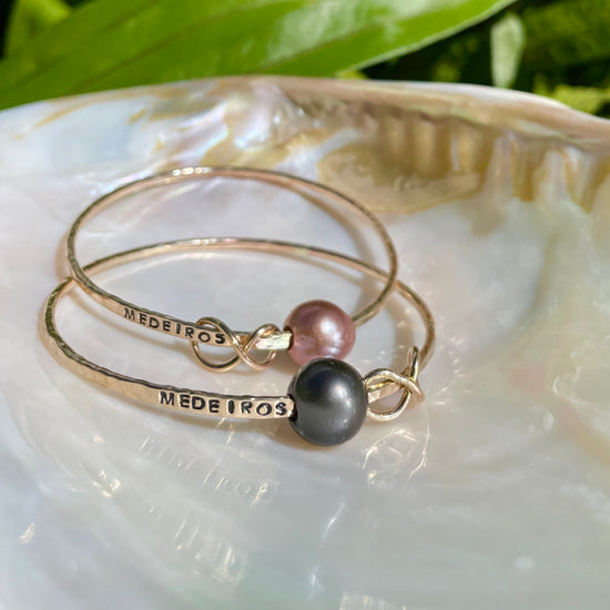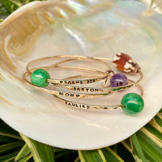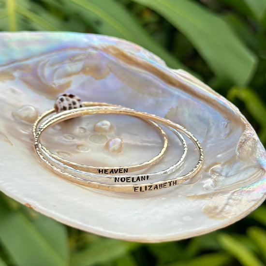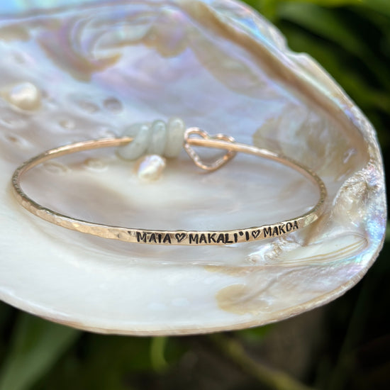 We know that a piece of jewelry is more than just a fashion statement, it represents your personality. The Custom Stamped Bangle is hand stamped and can include your name or a loved ones. Add your favorite shell, charm or pearl to personalize it even further and make it truly yours!