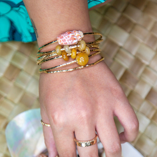 ✧To clean: Simply wash your bangles using mild dish soap and water. Lather the soap and water in your hands. Next, gently swipe the soapy mixture through the bangle. Pat dry with a napkin or cloth and let sit to fully dry. You may also use mineral oil to bring back shine to your shells.