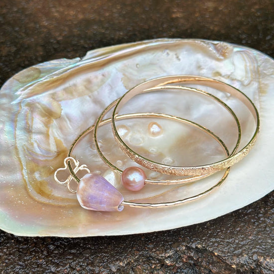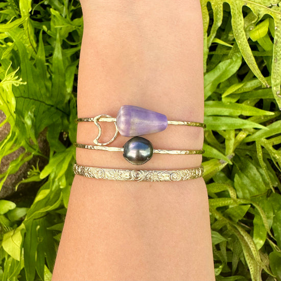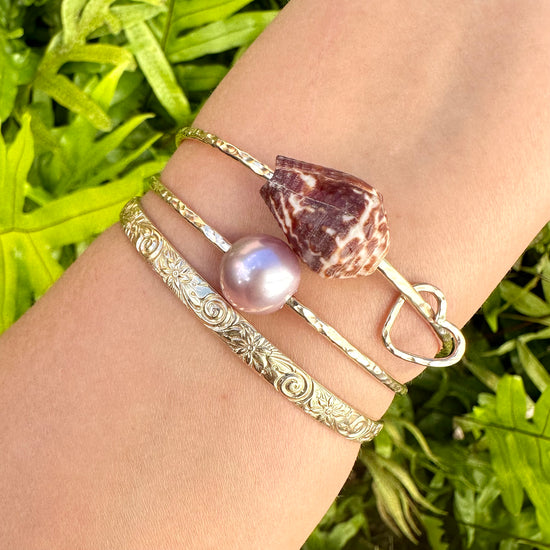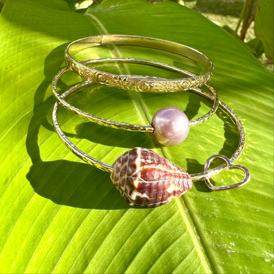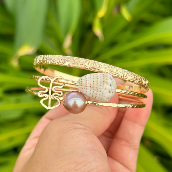A uʻi combination of bangles youʻll never want to take off! From the stunning pearl and handpicked shell, all the way to the beautifully designed Kaʻiulani bangle. You will fall in love every time you look at this stack!