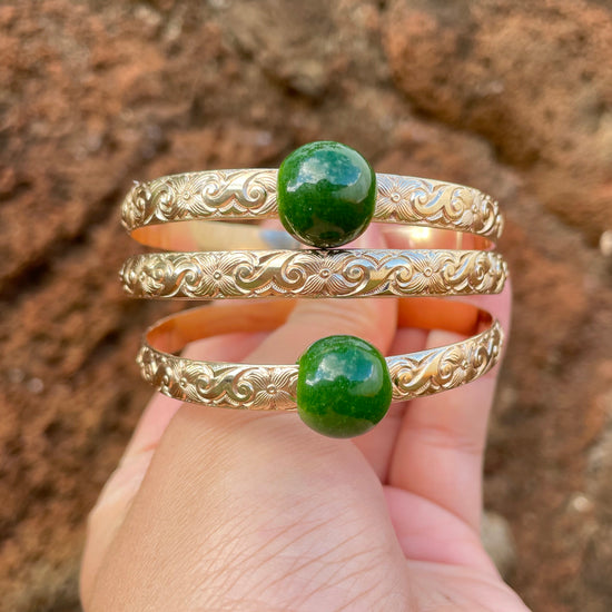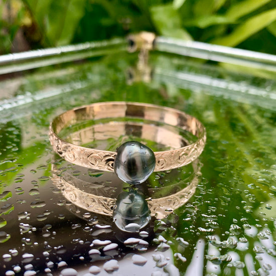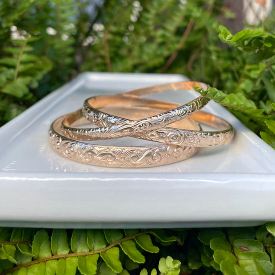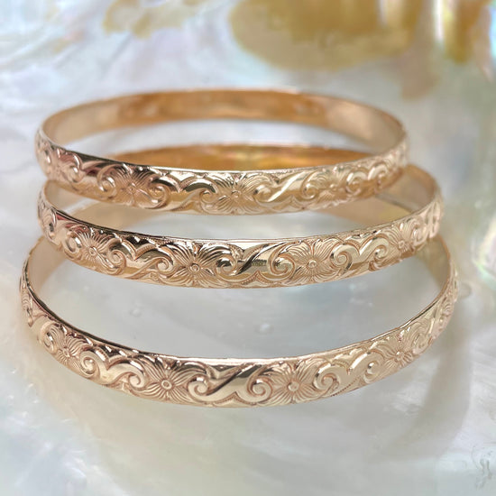 This bangle-bracelet measures at 6.4 x 1.7mm. It is also the largest in size out of all 3 Hawaiian Heirloom inspired bangle bracelets. This design is characterized with a heritage scroll and plumeria flower influence.
