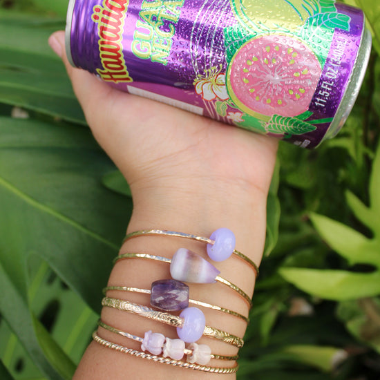 This listing is for the Kauwela Guava Nectar Donut Bangle. The vibrant purple color reminds us of the delicious Guava Nectar from Hawaiian Sun.