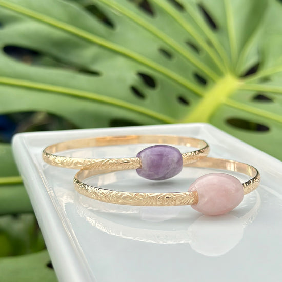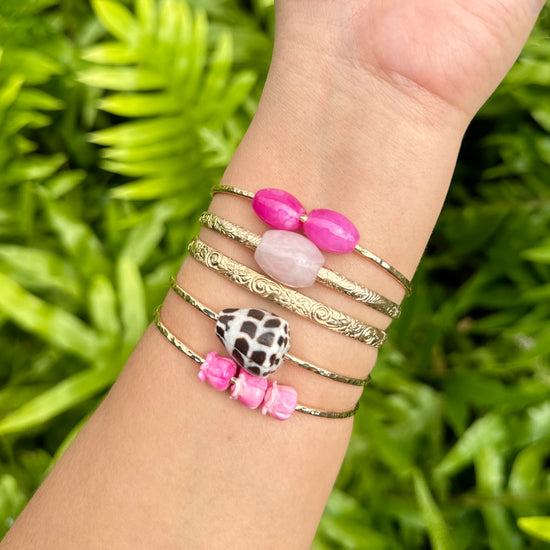 Add another bangle to you stack by including the Liliʻuokalani Bangle featuring a Rose Quartz BarrelIts perfect for adding some sparkle to your wrist, and the Rose Quartz stone adds a pop of color that will keep your attention drawn to it all day.