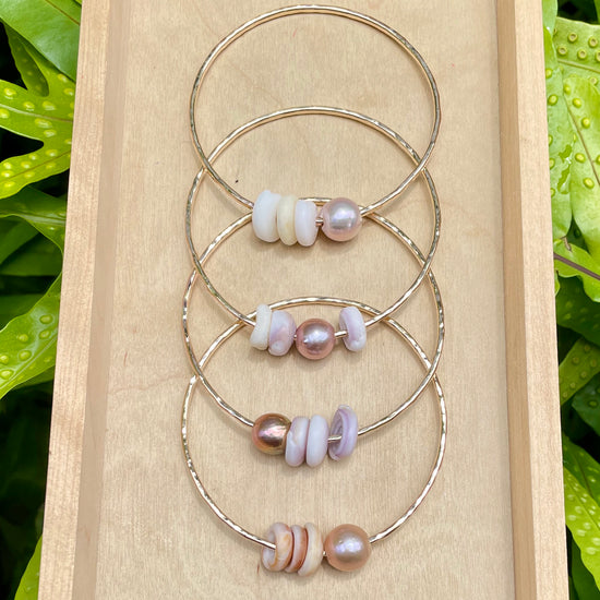 Another classic, the Puka Shell bangle which includes 3 puka shells. Ocean tumbled cone shells break down to form these pretty shells. This bracelet epitomizes nature's beauty, magnificence and serenity.
