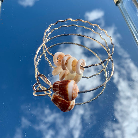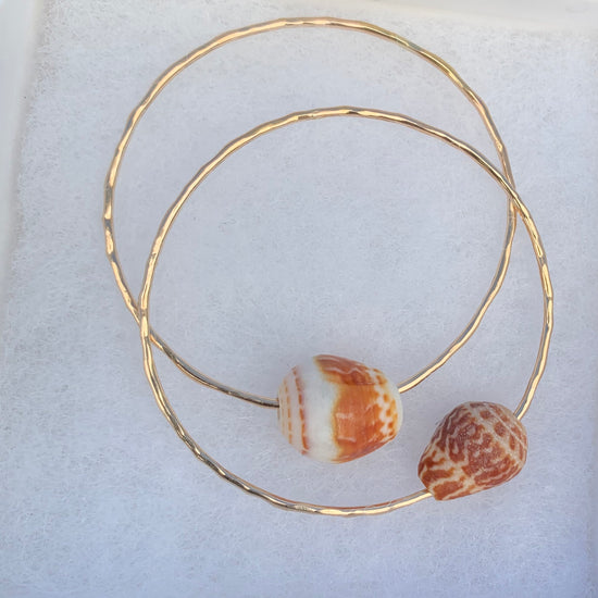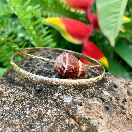 Adorn yourself with the vibrant Brown-Orange Chaldean Cone Shell Bangle. The color is standout and the design is one of a kind, with white axial streaks all over the orange brown body. Pair this with any bangle stack for an accentuated wrist.