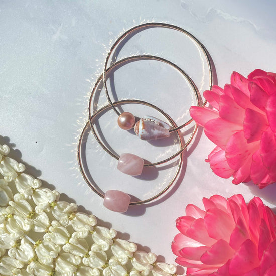 The handcrafted Rose Quartz Barrel Bangle features a Pink Rose Quartz crystal which is known to boost feelings of self love. This blush pink shade is gorgeous and will look great stacked with other bangles.