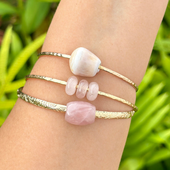Precious and gorgeous, this Rose Quartz Trio Bangle is sure to become a new favorite. It features three Rose Quartz Donut Beads, in a clear pink shade.