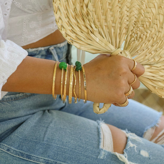 When you are not using your bangles, store them in a dry place. Avoid exposing your bangles to cleaning chemicals, pools, sauna’s, beaches etc. which could cause jewelry to oxidize quickly. However, if you do find yourself in a compromising position, please follow with a wash.
